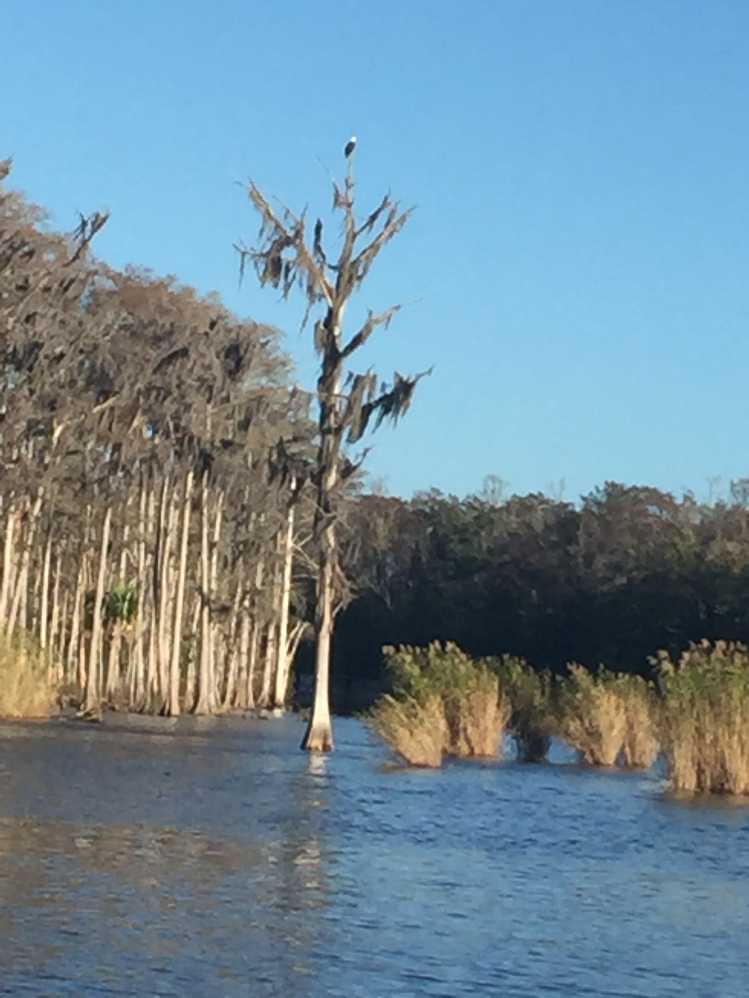 A word from Sammy: These eagles (three in two days) are scary as they eye me from aloft but at least we have seen no alligators or snakes. Please let Gio, Gillie and Aunt Missy know that I am mostly doing fine. The run on Pensacola beach was f-a-n-t-a-s-t-i-c except that the hoped for refreshing drink turned out to be no unsalted Lake Michigan. Most overnights allow for some good smelling walks, and the sleeping is peaceful as I am always tired after a hard day at the helm. The downside was the burrs I got into yesterday that took hours for the staff to remove, as I lay like the princess that I am. It is a tough life!